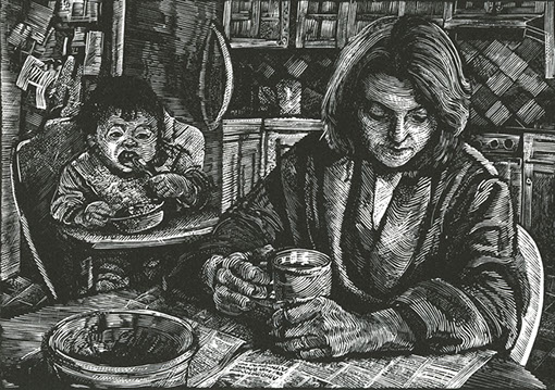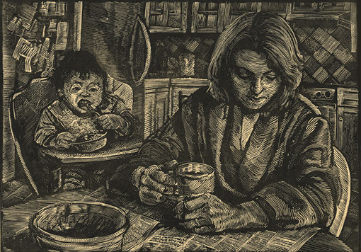 This wood-engraving print by Michael McGarvey “Breakfast” is limited to an edition of 111 signed and numbered prints, printed on Mohawk Superfine Paper.