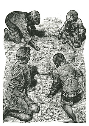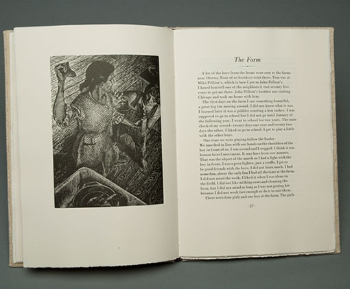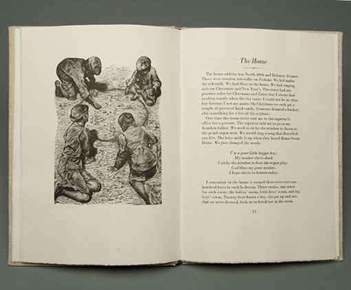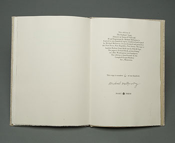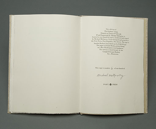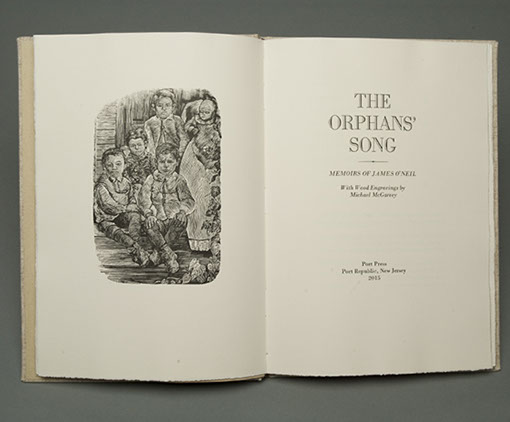 This edition of The Orphans' Song; Memoirs of James O'Neil with Wood Engravings by Michael McGarvey is limited to one hundred copies, numbered and signed by the artist. It was designed and printed at the Port Press, Port Republic, New Jersey. The type is hand-set Bodoni Semi- Bold cast by M&H Type. The paper is Zerkall Book, printed damp on a Hoe Washington iron handpress. The edition is hand-bound at the Cambell Logan Bindery Inc., Minnesota.
