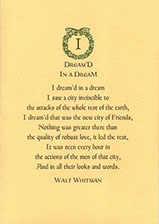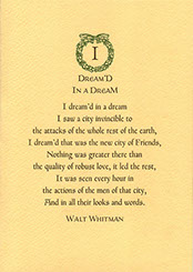 This two color letterpress card of Walt Whitman selection printed using ATF Fransciscan and Friar small caps. The idea came for this card came shortly after 9/11/01. These are limited to an edition of 206 signed and numbered prints. It is printed using on Arturo Butter-cream Paper in brown and green.